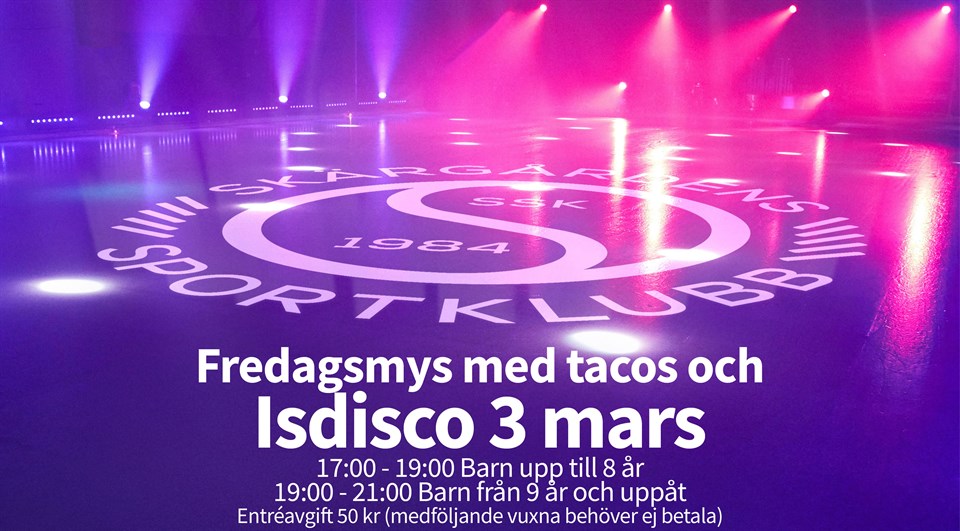 Fredagen den 3 mars får ni planera för fredagsmys i hallen, då är det äntligen dags igen för Isdisco! Kvällen är uppdelad i två olika åldersgrupper: Klockan 17:00-19:00 Barn upp till 8 år Klockan 19:00-21:00 Barn från 9 år och uppåt Entréavgift 50 kr (medföljande vuxna behöver ej betala) Det kommer att finnas tacos och annat gott till försäljning i caféet. Samt fiskdamm för de mindre barnen och lotterier. Kom gärna ”disco-klädd”. Välkomna!
