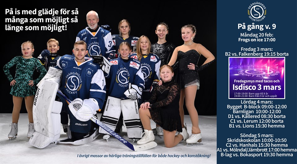 Välkomna till ännu en härlig vecka och just idag skiner solen! Ordinarie säsong börjar lida mot sitt slut men ännu finns det en del matcher kvar att spela! På fredag em/kväll så är det dags för oss att återupprepa succén från förra året, det är dags för isdisco i hallen igen! Så nu är det dags att leta fram paljett-kläderna i garderoben och har du inte möjlighet att vara med på isen så tycker jag bara att ni ska komma förbi och se på alla glada barn och ungdomar. Förra årets isdisco var verkligen superlyckat och vi hoppas såklart att det blir lika lyckat igen. Från kl. 17:00 - 19:00 så är det disco för barn upp till 8 år. Från kl. 19:00 - 21:00 så är det disco för barn från 9 år och uppåt. Är det också så att du har möjlghet att vara med och hjälpa till om ditt barn t ex är där så hör av dig till kansliet! All hjälp tas tacksamt emot. Välkomna!