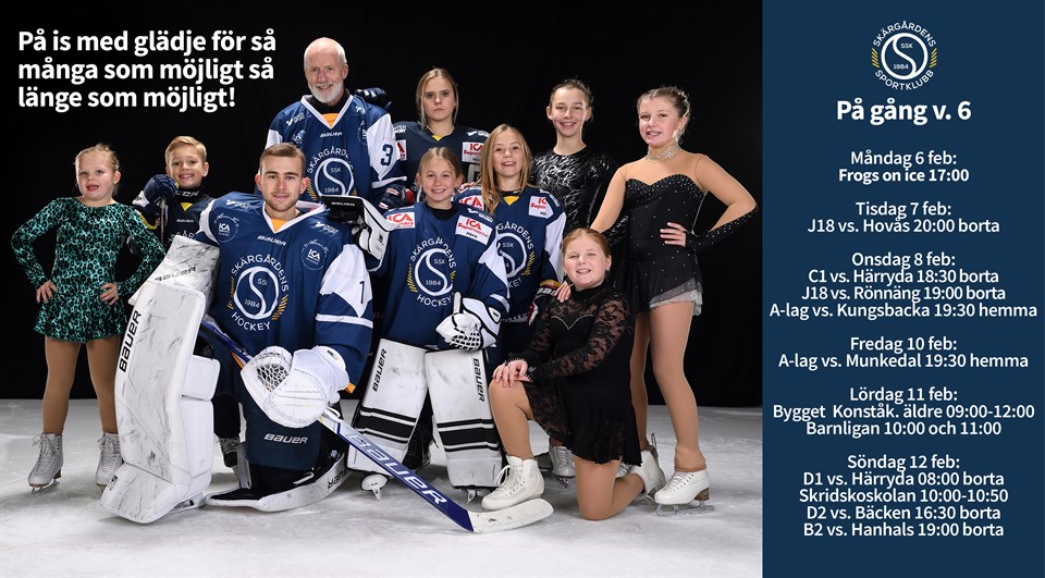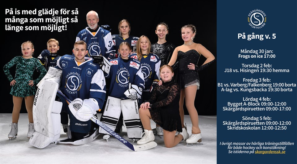 Tiden rusar och nu är Januari snart slut, man märker verkligen att dagarna blir lite längre för varje dag som går. Denna vecka har vi endast en hemmamatch i hallen då J18 möter Hisingen IK på onsdag kväll. A-laget möter Kungsbacka och B1 möter Varberg/Falkenberg borta på fredag kväll. Ingen Barnliga på lördag eftersom det är Skärgårdspiruetten i hallen både lördag (heldag) och söndag (halvdag). Skridskoskolan kommer dock att ha sitt ispass på söndag efter tävlingarnas slut mellan 12:00-12:50. Vi fortsätter också vårt arbete i våra nya lokaler på lördag mellan 09:00-12:00, extra pinpointade denna gång är A-blocket och det ska också ha gått ut mail om detta. Självklart är alla välkomna att vara med även om man inte tillhör A-blocket. Vi behöver all hjälp vi kan få! Välkomna!