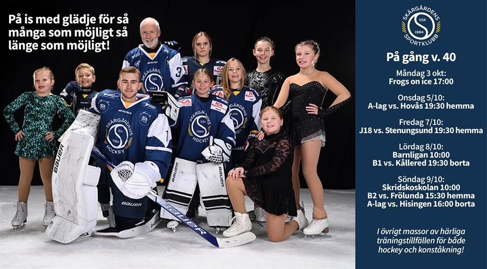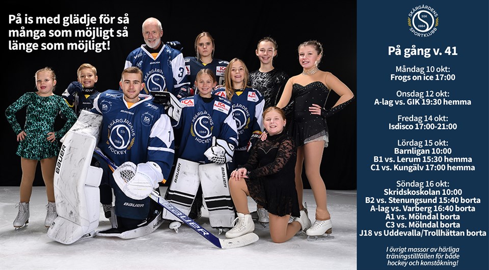 Som vanligt så har vi en vecka framför oss med massor av aktiviteter, både matcher hemma och borta samt massor av träningstillfällen både för hockeyspelare och åkare! Konståkningssektionen har också Iskristallen, en klubbtävling som anordnas för B-åkare (lördag) och Stjärntävling för C-åkare (söndag). Ikväll anordnas en utbildning för föreningsdomare i paviljongen mellan 17:00-20:30. Vi vill så klart att så många som möjligt vill vara med! Vi behöver fler domare och det är också ett bra tillfälle att tjäna en slant. 17:00 - 18:30 Nybörjare 18:30 - 20:30 Uppföljning Välkomna att ta del av denna veckas aktiviteter!