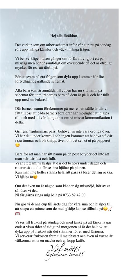 Hej Här kommer ett brev om lite mer info angående söndag, vi kommer även lägga ut ett uppdaterat arbetsschema. Ses på söndag allesammans :) Med vänlig hälsningar team 15 Team 15 5 apr 2024 3kommentarer