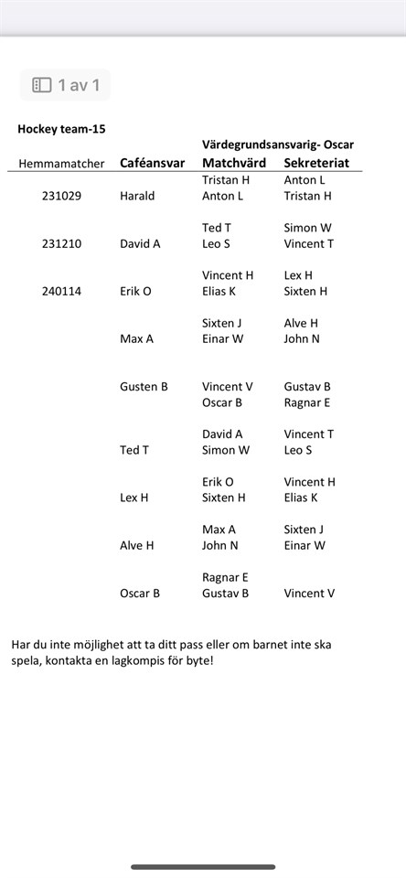 Hej Nu är det bara några dagar kvar till vår första hemmamatch! Här har vi gjort ett schema över när ni som föräldrar behöver hjälpa till under hemmamatcherna. Det är tre olika områden där vi behöver ha er som föräldrar som hjälper till, det är café, matchvärd och sekretariatet. Är det så att ni inte har möjlighet att hjälpa till den dagen som ert namn står. Se om ni kan byta med någon inom ert område och i annat fall kontakta någon av oss lagledare. Team 15 26 okt 2023 3kommentarer